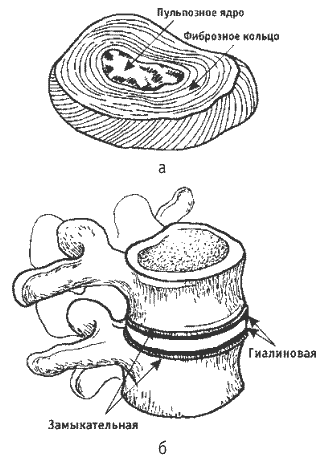 Сверху и снизу пульпозное ядро с фиброзным кольцом покрыто гиалиновой пластинкой, играющей большую роль в транспортировке воды и питательных веществ к пульпозному ядру и выведении продуктов обмена. Гиалиновая пластинка очень плотно прилегает к замыкательным пластинкам, которые жестко срастаются с телами смежных позвонков, защищая их губчатое вещество от чрезмерных нагрузок. Известно, что, пока наш организм растет (до 20–25 лет), межпозвонковый диск имеет сосудистую сеть, то есть питается через сосуды, которые проходят через тела позвонков, но к 20–25 годам жизни запустевают (облитерируются).