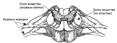 Все сегменты устроены одинаково. Они состоят из серого и белого веществ, как и головной мозг. Серое вещество, то есть нервные клетки, находится в центре и по форме напоминает крылья бабочки, или букву Н (рис. 5). Вокруг нервных клеток проходят пучки или тракты аксонов, имеющих белый цвет.