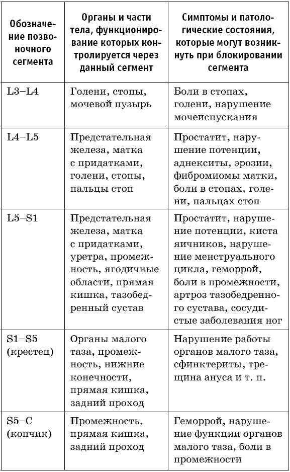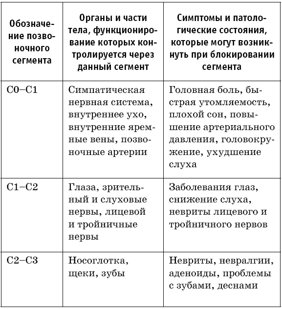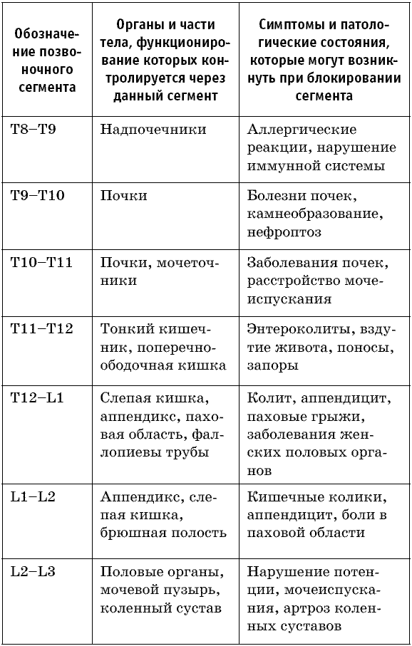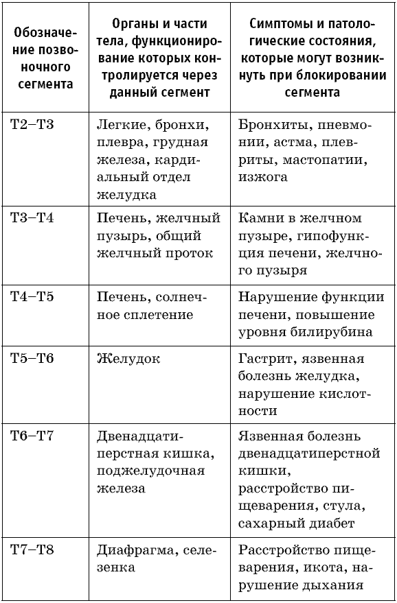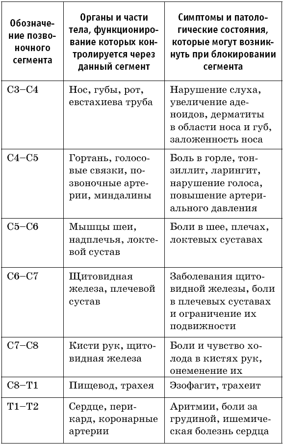 Если в позвоночнике возникают проблемы, это обязательно сказывается на состоянии всего организма. В зависимости от того, какой сегмент позвоночника затронут, появляются различные симптомы и патологические состояния (табл. 1).