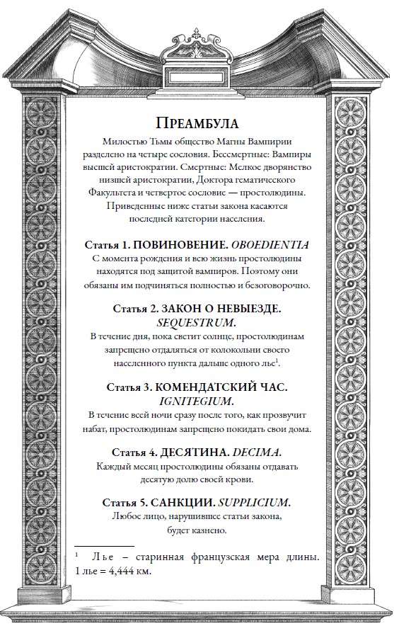 Это то счастливое время года, те несколько недель, когда еще тепло и можно гулять без пальто. Счастливое время, когда жители городка почти забывали о Кодексе смертных, который на протяжении многих поколений подавлял Магну Вампирию – внушительную коалицию, объединившую Францию и ее вице-королевства.