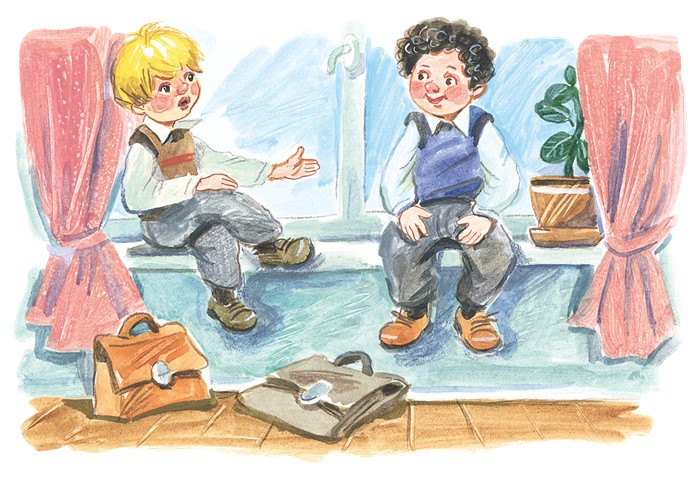Один раз мы с Мишкой вошли в зал, где у нас бывают уроки пения. Борис Сергеевич сидел за своим роялем и что-то играл потихоньку. Мы с Мишкой сели на подоконник и не стали ему мешать, да он нас и не заметил вовсе, а продолжал себе играть, и из-под пальцев у него очень быстро выскакивали разные звуки, они разбрызгивались, и получалось что-то очень приветливое и радостное. Мне очень понравилось, и я бы мог долго так сидеть и слушать, но Борис Сергеевич скоро перестал играть. Он закрыл крышку рояля и, увидев нас, весело сказал: