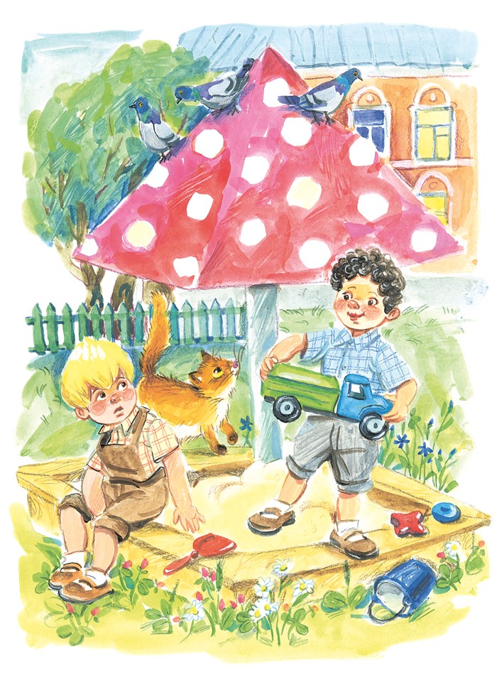 – Ого! – сказал Мишка. – Где достал? А он сам набирает песок? Не сам? А сам сваливает? Да? А ручка? Для чего она? Её можно вертеть? Да? А? Ого! Дашь мне его домой?