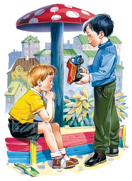 – Ого! – сказал Мишка. – Где достал? А он сам набирает песок? Не сам? А сам сваливает? Да? А ручка? Для чего она? Её можно вертеть? Да? А? Ого! Дашь мне его домой?