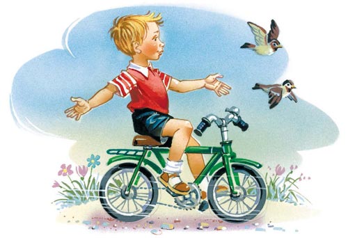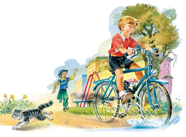 Это было чудесно! Ветерок засвистел у меня в ушах, всё вокруг понеслось быстро-быстро по кругу: столбик, ворота, скамеечка, грибы от дождя, песочник, качели, домоуправление, и опять столбик, ворота, скамеечка, грибы от дождя, песочник, качели, домоуправление, и опять столбик, и всё сначала, и я ехал, вцепившись в руль, а Мишка всё бежал за мной, но на третьем круге он крикнул: