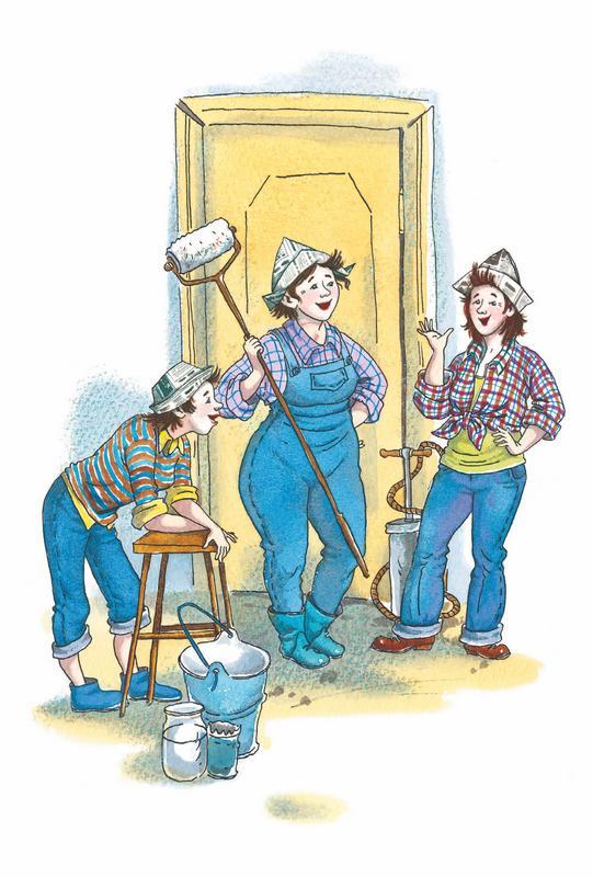 И вместо дяди Гриши во двор пришли три девушки. Они все были очень красиво одеты: носили мужские длинные штаны, измазанные разными красками и совершенно твёрдые. Когда эти девушки ходили, штаны на них гремели, как железо на крыше. А на головах девушки носили шапки из газет. Эти девушки были маляры и назывались: бригада. Они были очень весёлые и ловкие, любили смеяться и всегда пели песню «Ландыши, ландыши». Но я эту песню не люблю. И Алёнка. И Мишка тоже не любит. Зато мы все любили смотреть, как работают девушки-маляры и как у них всё получается складно и аккуратно. Мы знали по именам всю бригаду. Их звали Санька, Раечка и Нелли.