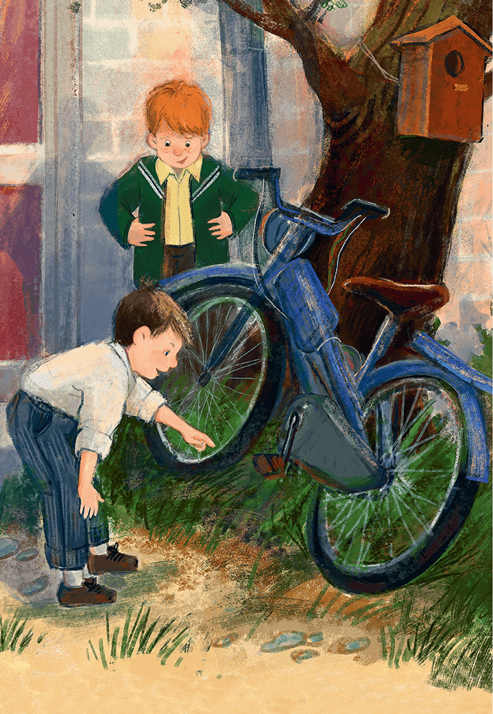 А этот дяденька, что на велосипеде, подъехал к Мишкиному парадному и остановился. И он оказался совсем не дяденькой, а молодым парнем. Потом он поставил велосипед около трубы и ушел. А я остался тут же с разинутым ртом. Вдруг выходит Мишка.