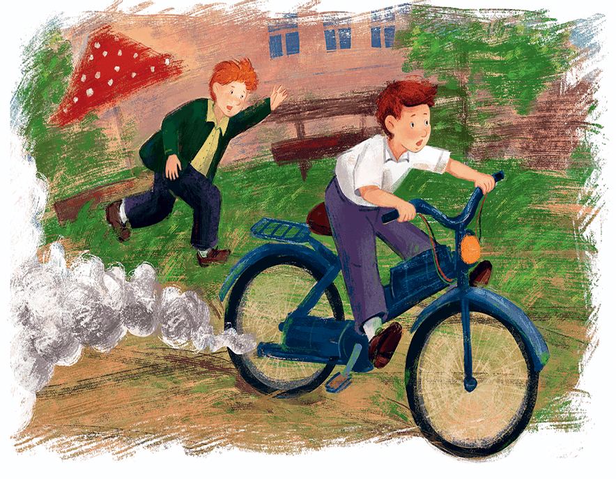 И вот однажды к нам во двор въезжает велосипед. И дяденька, который на нем сидит, не крутит ногами, а велосипед трещит себе под ним, как стрекоза, и едет сам. Я ужасно удивился. Я никогда не видел, чтобы велосипед ехал сам. Мотоцикл – это другое дело, автомобиль – тоже, ракета – ясно, а велосипед? Сам?