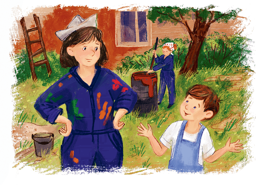 Мы сразу подошли ближе и стали смотреть на тот кусочек дома, где они только сейчас красили. Было очень здорово: ровно и коричнево, с небольшой краснотой. Мишка смотрел-смотрел, потом говорит: