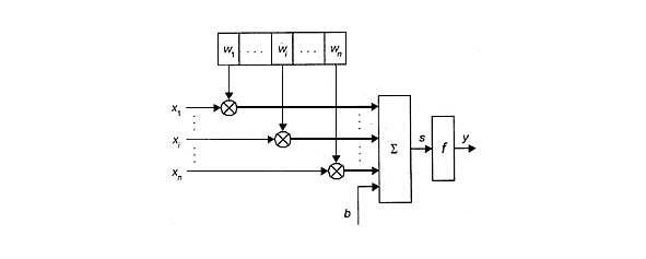 Нелинейный преобразователь f реализует нелинейную функцию преобразования значение выхода сумматора, согласно функции активации (передаточной функции) нейрона. Структура искусственного нейрона представлена ниже