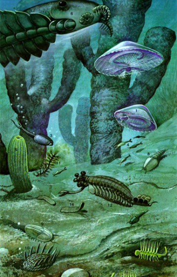 Во время кембрийского периода жизнь процветала. Жизнь оставалась практически неизменной на протяжении миллионов лет, но в кембрийский период вдруг начали появляться новые формы. Экзотические ракообразные и трилобиты стали доминирующей формой жизни в огромном количестве и разнообразии. Моллюски и гигантские водные членистоногие, похожие на насекомых, наполнили море. Эти существа имели жёсткий экзоскелет. Бурному развитию жизни способствовало накопление кислорода в атмосфере и воде в начале кембрия. Жизнь процветала до тех пор, пока более 40% всех видов внезапно не исчезли 488 млн лет назад. Те, что остались, подверглись трансформации из-за изменений в суровой окружающей среде. Что это были за изменения – мы не знаем. Одна теория говорит, что произошёл ледниковый период. Крайние перепады температуры могут легко привести к исчезновению огромного количества видов. Это событие ознаменовало исчезновение границ между кембрийским и ордовикским периодами.