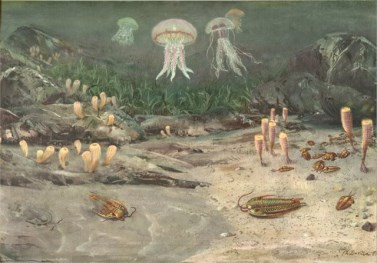 В морях кембрия также обитали губки, черви, начали развиваться головоногие, пластинчатожаберные и брюхоногие моллюски, морские пузыри.