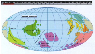 Кембрийский период (542—486 млн лет назад.) продолжался примерно 56 млн лет, существовали: Североамериканская, Русская, Сибирская, Колымская и Китайская платформы, в южном полушарии – огромный материк Гондвана, который объединял современную Южную Америку, Африку, Австралию и Антарктиду.