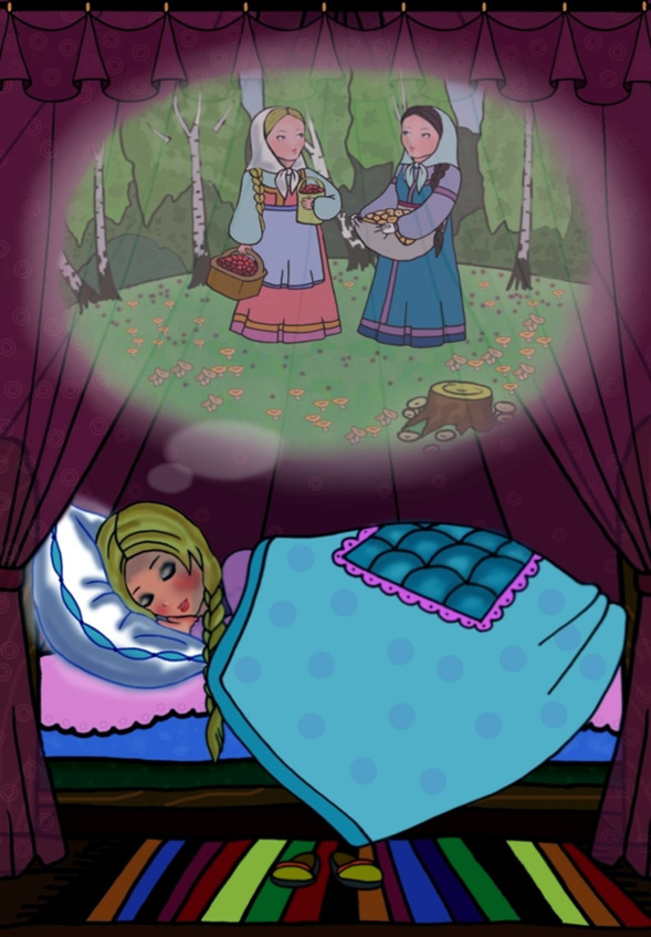 With these thoughts Alena fell asleep. In her dream, she saw a forest and a wonderful meadow spangled with berries and mushrooms. They were walking around with her sister and picking them, and they had full baskets, too heavy to carry. Fortunately, they saw a man riding on a cart. He agreed to help the girls. They put their supplies in the cart, occupying all the space, and brought them home.