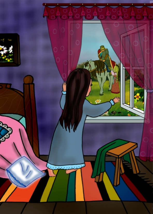 And Clara liked to sleep until midday, but the noise in the yard woke her up. She looked out the window and froze. Her sister was going away with a young handsome prince and his men. And she could see that the youth was looking at Alena with loving eyes and she was looking at him in the same way.