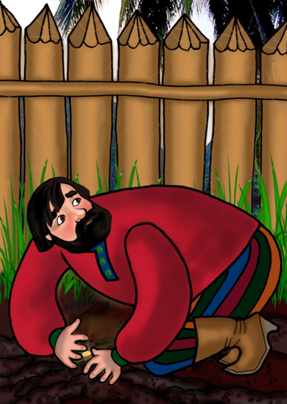 The Merchant dug a hole in the field and planted his gold seed. He tried to hide and cover where he did it so that the Farmer wouldn’t see it so well that instantly forgot where he planted his seed. First, he was worried, and then calmed down. «That was a smart idea of mine,» he thought. «The seed is magic; it’s made of gold, so one doesn’t need to take care of it. It doesn’t need any work. The only thing I have to do is to wait till the gold wheat grows.»