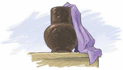 Пётр Петрович вынимает из портфеля глиняный горшок и сиреневую тряпку. Кладёт эти предметы на стол. Один конец тряпки он засовывает в горлышко кувшина, а другой свисает на стол.
