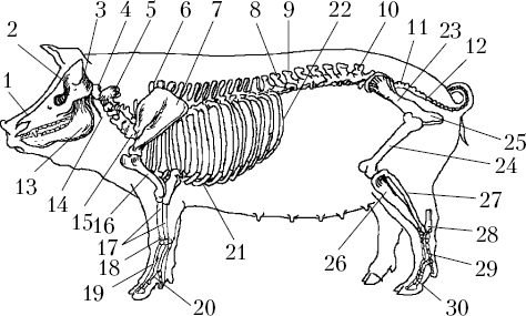 Скелет свиньи: 1 – носовая кость; 2 – лобная кость; 3 – затылочная кость; 4 – атлант; 5 – гребень второго шейного позвонка; 6 – первый грудной позвонок (его остистый отросток); 7 – лопатка; 8 – четырнадцатый грудной позвонок; 9 – первый поясничный позвонок; 10 – седьмой поясничный позвонок; 11 – крестцовая кость; 12 – хвостовые позвонки; 13 – нижняя челюсть; 14 – яремный отросток; 15 – поперечнореберный отросток шестого позвонка; 16 – плечевая кость; 17 – кости предплечья; 18 – запястье; 19 – пясть; 20 – фаланги пальцев; 21 – грудная кость; 22 – ребра; 23 – подвздошная кость таза; 24 – бедренная кость; 25 – седалищная кость; 26 – большеберцовая кость; 27 – малоберцовая кость; 28 – заплюсна; 29 – плюсна; 30 – фаланги пальцев