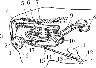 Половые органы хряка: 1 – мошонка; 2 – правый семенник; 3 – хвост придатка; 4 – прямая кишка; 5 – луковичные (куперовы) железы; 6 – предстательная железа; 7 – пузырьковидные железы; 8 – почки; 9 – мочеточники; 10 – мочевой пузырь; 11 – дивертикул препуция; 12 – препуций; 13, 14 – половой член; 15 – семяпровод; 16 – головка придатка; 17 – тело придатка семенника; 18 – начало семяпровода