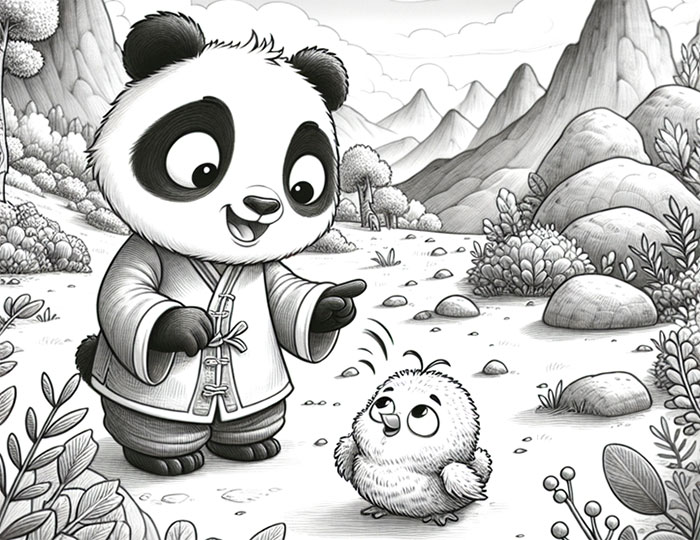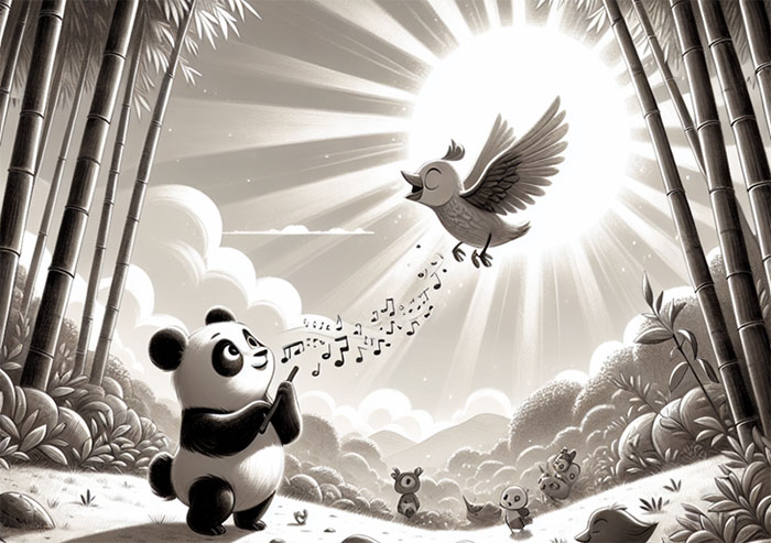 Слова панды показались Птенчико вдохновляющими и наполненными смыслом. В его сердце проснулись смелость и решимость, он поверил в свои инстинкты, оторвался от ветки и, расправив крылышки, взмыл в небо над кронами деревьев. Лучи солнца озарили его путь, а Шао сиял гордостью за своего друга.