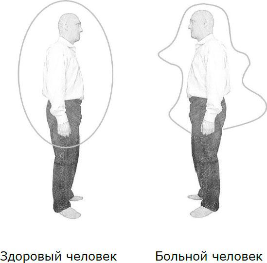 Энергетические центры контролируют работу своих определенных органов. Красная чакра находится в области промежности и контролирует половые органы. Оранжевая – напротив лобка (кишечник). Желтая – в районе пупка (печень и желудок). Зеленая – на груди (сердце и легкие). Голубая – в районе шеи (горло и нос). Синяя – в центре лба (глаза). Фиолетовая – на макушке (головной мозг). Когда все чакры работают гармонично, то человек ощущает себя великолепно и биополе вокруг него имеет вид большого ровного кокона яйцевидной формы. При болезнях форма кокона неровная. У совершенно здорового человека биополе ощущается на расстоянии в один или два локтя от тела, у больного – в пол локтя и менее. Перед смертью человека биополе концентрируется вокруг головы и быстро исчезает, при этом вес уменьшается на несколько миллиграммов. Форма и размер биополя определяется лозой, рамками, маятником и руками.