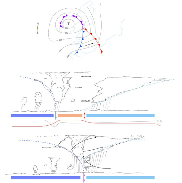 • Динамика. Этот процесс часто приводит к усилению циклонов и может быть причиной бурных погодных условий, таких как ливни, грозы и резкие изменения температуры.