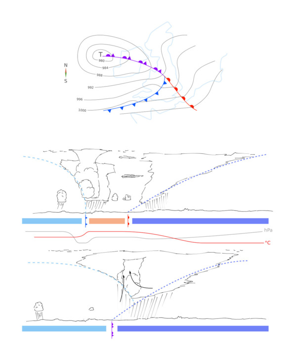 Когда холодный фронт обгоняет теплый фронт, теплый воздух между ними поднимается вверх, поскольку более холодный воздух с обеих сторон (как от холодного фронта, так и от возвращающегося холодного воздуха, который приходит с тыла циклона) не может поддерживать его на земле. В результате теплый воздух оказывается «пойманным» между двумя холодными воздушными массами и поднимается в верхние слои атмосферы. Это приводит к образованию облаков, дождям и другим метеорологическим явлениям, связанным с фронтальными процессами.