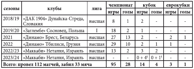Затем не без успеха выступал за динамовские клубы Бреста (2021 год) и Тбилиси (2022). В этих командах регулярно получал игровую практику, прилично забивал и с тбилисцами сумел выиграть чемпионский титул в грузинском чемпионате.