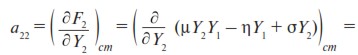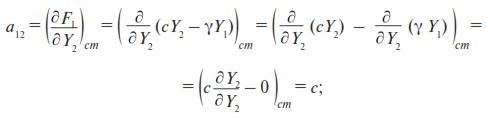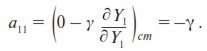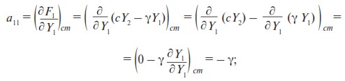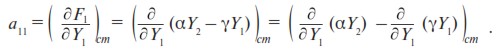 В первом слагаемом берется частная производная по переменной Y1 от выражения αY2, которое, как видим, не содержит Y1, поэтому, согласно правилу вычисления частной производной, это выражение считается постоянным и производная от нее равна нулю. Во втором слагаемом производная берется от выражения γY1, которое считаться постоянным не может, так как содержит Y1. Поэтому дальнейшие вычисления для a11 примут вид