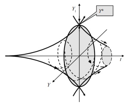 2.1.5. На рис. 2 показана «сшивка» эволюционных диаграмм двух описанных ситуаций. Линией с пониженной яркостью обозначены фазовые траектории переменных Y1 и Y2. Огибающие этих траекторий выделены.