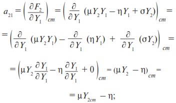 2.1.3. Обратите внимание: наша модель средней фирмы имеет две переменные Y1 и Y2. Следовательно, мы можем воспользоваться результатами Приложения П2.3, полученными для системы, так же с двумя переменными. В частности, чтобы проверить стационарное решение (19) на устойчивость, достаточно определить соотношение знаков у величин B, ∆ и D. Последние вычисляются по формулам (П22). В эти формулы входят четыре коэффициента линейного разложения: a11, a12, a21 и a22. Их мы найдем с помощью (П12), в которой Fi возьмем из системы эволюционных уравнений (18) нашей задачи.