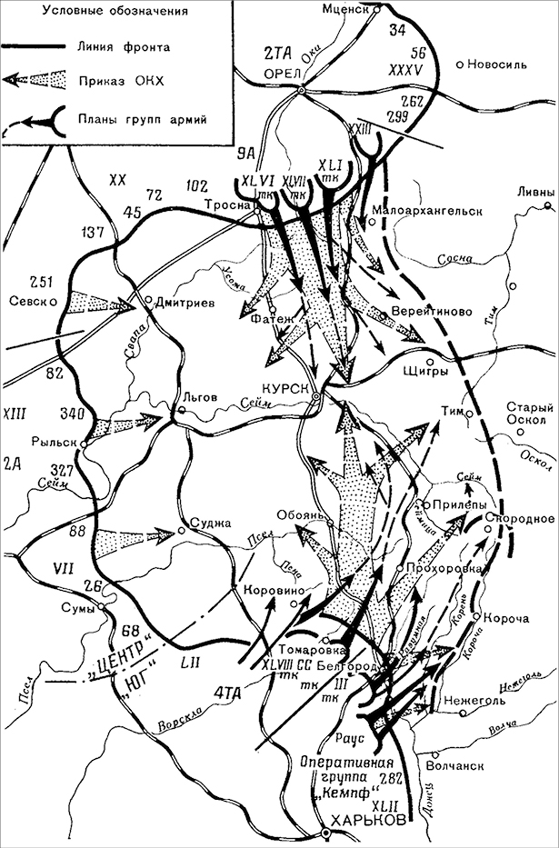 Германское командование решило провести летом 1943 г. крупную наступательную операцию под названием «Цитадель» и вновь захватить в свои руки стратегическую инициативу. Замысел операции состоял в том, чтобы мощными встречными ударами из районов Орла и Белгорода на Курск окружить и уничтожить советские войска в Курском выступе. В дальнейшем противник намеревался разгромить советские войска в Донбассе. К проведению операции он привлек группу армий «Центр» под командованием генерал-фельдмаршала Г. фон Клюге (9-я и 2-я армии) и группу армий «Юг» во главе с генерал-фельдмаршалом Э. фон Манштейном (4-я танковая армия и оперативная группа «Кемпф»). В двух группировках было сосредоточено 50 дивизий, в том числе 12 танковых и 2 моторизованных. Эта группировка насчитывала около 780–900 тыс. человек, около 10 тыс. орудий и минометов, около 2700 танков и более 2050 самолетов[1]. Всего на курском направлении противник сосредоточил около 70 % танковых соединений, находившихся на советско-германском фронте. «Вся наступательная мощь, которую германская армия способна была собрать, была брошена на осуществление операции «Цитадель…» – отмечал бывший генерал вермахта В. Эрфурт[2].