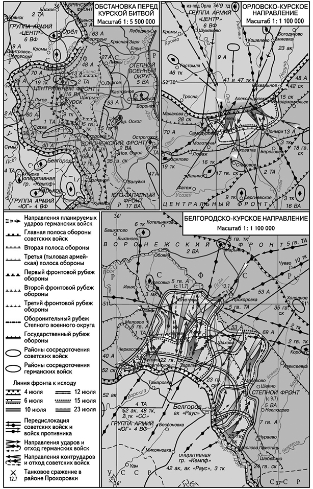 Степным фронтом генерал-полковника И.С. Конева был подготовлен рубеж по реке Кщень. Одновременно создавался также государственный рубеж по реке Дон. Вся глубина обороны на курском направлении достигла 250–300 км. Оборонительные рубежи подготавливались не только войсками, но и населением прифронтовых районов Курской, Орловской, Воронежской и Харьковской областей. По мнению генерала армии С.М. Штеменко, глубокая многополосная оборона действующих фронтов, расположение на ней сильных стратегических резервов, безусловно, обеспечивали возможность при всех обстоятельствах остановить противника[15].