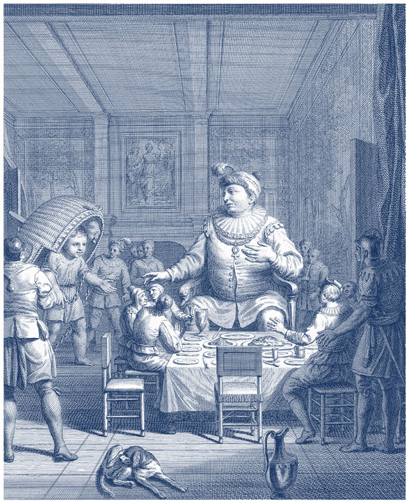Пантагрюэль входит в комнату, где за столом сидит его отец Гаргантюа. Гравюра П. Танже, нач. XVIII в.
