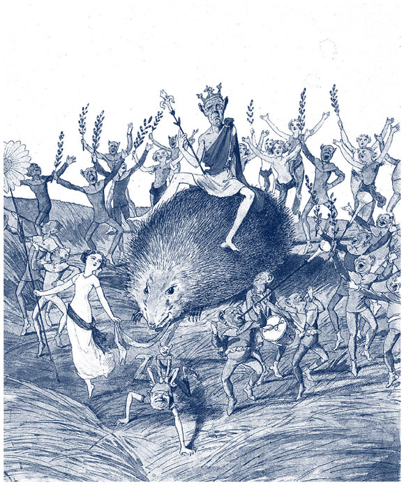 Король фей верхом на ежике в сопровождении танцующих подданных. Акварель К. А. Дойла, XIX в.