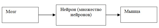 Работа мозга. Нейрон воспринимает воздействие от внешних раздражителей или от других нейронов и передаёт сигнал на мышцу, которая сокращается. Простейшая схема.