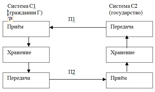 12.03.2005.Применение теории систем в анализе социальных процессов в государстве.Гражданин получает от государства поток П1, который пропорционален потоку П2, т. е. воздействию С1 на С2. Что посеешь, то и пожнёшь.