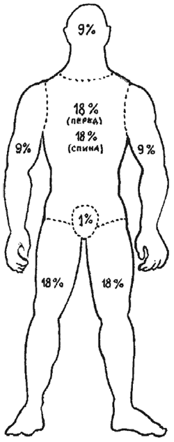 В соответствии с этим правилом вся поверхность тела делится на сегменты, каждый из которых составляет приблизительно 9% от общей поверхности тела: голова и шея – 9%; верхние конечности – по 9%, нижние конечности – по 18%, передняя и задняя поверхности тела – по 18%; гениталии и промежность – по 1%.