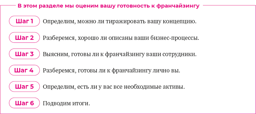 Чтобы такого не случилось, нужно честно ответить на все вопросы этой главы и честно оценить себя. Тогда к ее концу вы увидите, какие аспекты вашего бизнеса уже хороши, какие слегка «прихрамывают», а на чем нужно сосредоточиться, чтобы точно быть готовым к созданию успешной франшизной сети.