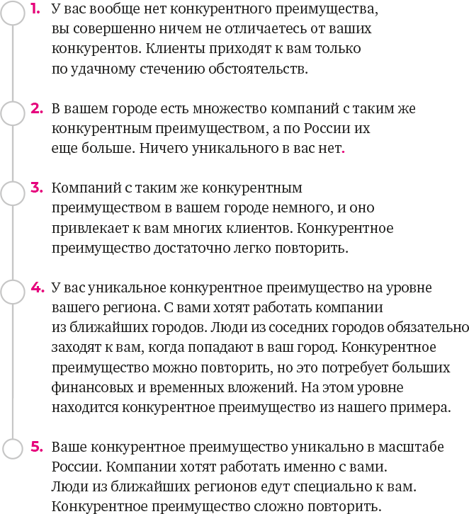 Более подробно про создание и развитие своего конкурентного преимущества вы можете почитать в книге Майкла Портера «Конкурентное преимущество. Как достичь высокого результата и обеспечить его устойчивость». (М.: Альпина Бизнес Букс, 2008)