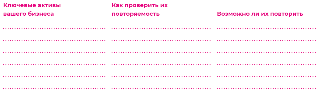 Теперь, когда мы с вами оценили каждое конкурентное преимущество, давайте разберемся: возможно ли их тиражировать? Этот вопрос не так прост, как может показаться, и об него спотыкались и продолжают спотыкаться многие начинающие франчайзеры. Дело в том, что они не связывают конкурентные преимущества с ключевыми активами бизнеса и не думают об их повторяемости.