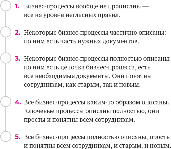 В идеале каждый ваш бизнес-процесс описывается в виде логической цепочки. Из нее любому должно быть понятно, какие ресурсы необходимы для осуществления процесса, с чего он начинается, как продолжается и чем заканчивается, а также каким должен быть его результат.