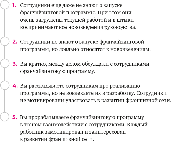 Оцените готовность ваших соучредителей по 5-балльной шкале, где 1 – партнеры не готовы к франчайзингу, 5 – у партнеров есть богатый опыт работы с франчайзи и они горят желанием работать с ними в будущем.