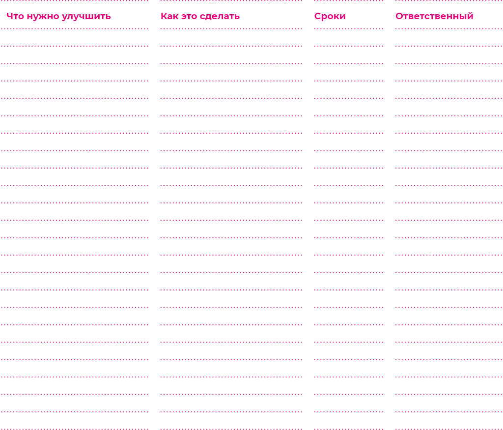 Чтобы ваши усилия по оценке бизнеса не пропали втуне, заполните эту таблицу – она станет вашим чек-листом, по которому вы будете готовить свою компанию к франчайзингу. Заполните ее и не откладывая в долгий ящик поставьте задачи соответствующим исполнителям.