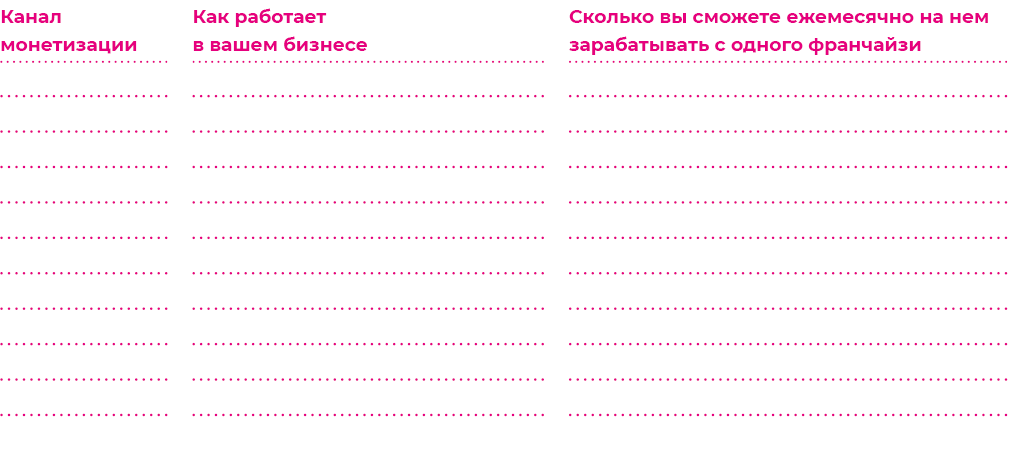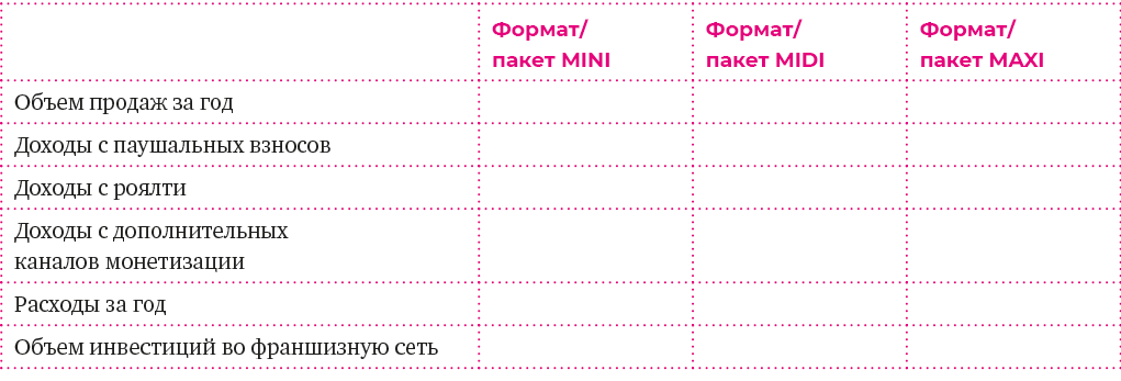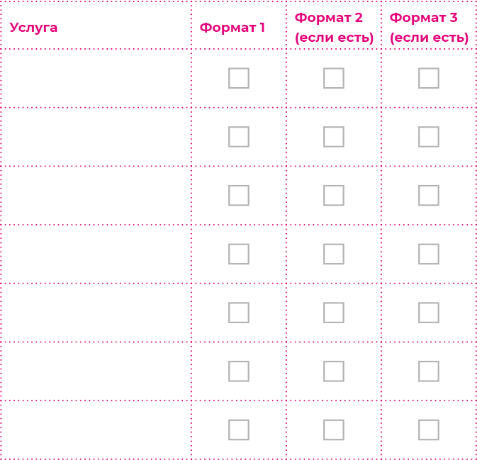 Если вы понимаете, что в вашем бизнесе франшиза может продаваться одновременно в нескольких форматах, – запишите их в соответствующих колонках. Например, франшиза суши-бара может продаваться в трех форматах: «Только доставка», «Остров в торговом центре», «Ресторан». И для каждого из этих форматов потребуется разный набор услуг. Просто поставьте галочку напротив соответствующего вида услуги, если она будет предоставляться в этом формате. Для разных форматов услуги могут как отличаться, так и быть абсолютно одинаковыми.