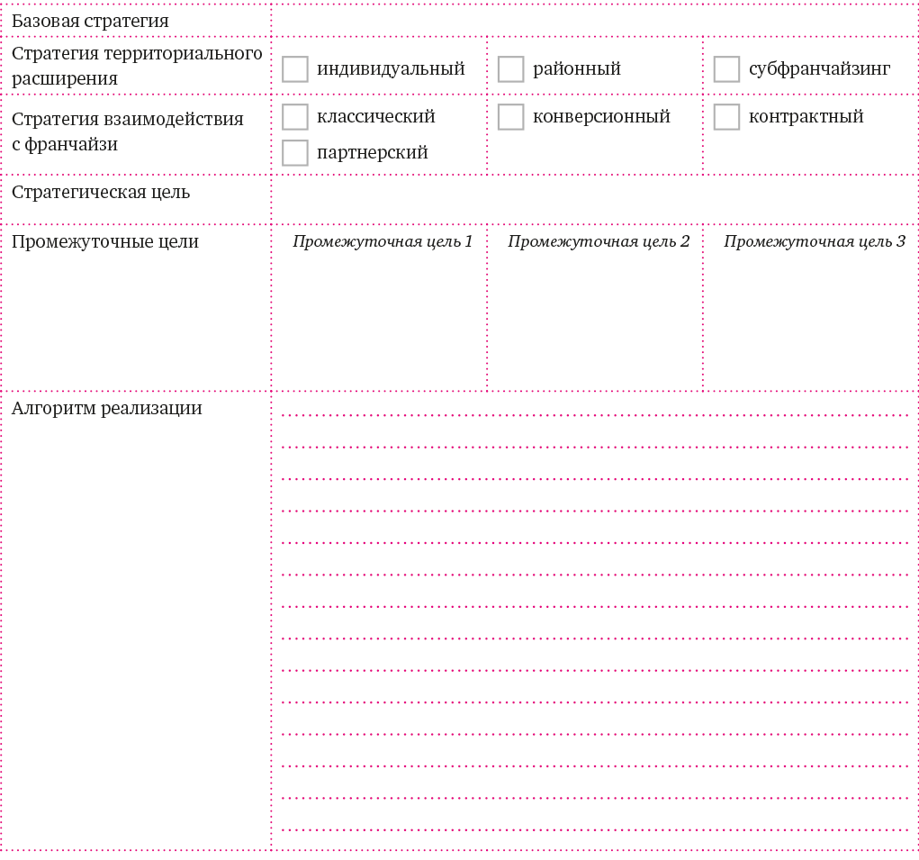 Зачем это нужноКонцепция франшизы – ключевой документ, который определяет стратегию продвижения и продаж (раздел 2), структуру руководства франчайзи, построение управляющей компании, характер взаимодействия с франчайзи, стратегию расширения – все те блоки, которые вы проработаете в этой книге. Концепция франшизы позволяет составить уникальное, конкурентоспособное предложение для франчайзи, быстрее достичь своих целей и минимизировать затраты на привлечение партнеров.