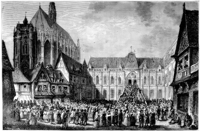 В этот день на Гревской площади зажигались потешные огни, у Бракской часовни происходила церемония посадки майского деревца, в здании Дворца правосудия давалась мистерия. Об этом еще накануне возвестили при звуках труб на всех перекрестках глашатаи господина парижского прево, разодетые в щегольские полукафтанья из лилового камлота с большими белыми крестами на груди.