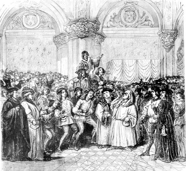 Между тем день 6 января 1482 года отнюдь не являлся датой, о которой могла бы хранить память история. Ничего примечательного не было в событии, которое с самого утра привело в такое движение и колокола, и горожан Парижа. Это не был ни штурм пикардийцев или бургундцев, ни процессия с мощами, ни бунт школяров, ни въезд «нашего грозного властелина господина короля», ни даже достойная внимания казнь воров и воровок на виселице по приговору парижской юстиции. Это не было также столь частое в XV веке прибытие какого-либо пестро разодетого и разукрашенного плюмажами иноземного посольства. Не прошло и двух дней, как последнее из них – это были фламандские послы, уполномоченные заключить брак между дофином и Маргаритой Фландрской, – вступило в Париж, к великой досаде кардинала Бурбонского, который, из угождения королю, должен был скрепя сердце принимать неотесанную толпу фламандских бургомистров и угощать их в своем Бурбонском дворце представлением «весьма прекрасной моралитэ, шуточной сатиры и фарса», пока проливной дождь заливал его роскошные ковры, разостланные у входа во дворец.