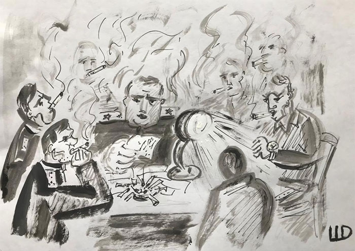 К концу дня в помещении собралось человек семь. Они всё чаще посматривали на часы, переглядывались меж собой. Суетились. В моторике их движений, во всём их обличии выступало что-то дерзкое, пьяное и распутное. Это раздражало и в то же время разжигало в сердце безумное желание любой ценой избавиться от них, признать любую вину, согласиться со всем, что они говорили, в чём обвиняли, но было непонятно, в чём… От папиросного дыма мрачного кабинета разъедало глаза, в голове звенело. Они продолжали жужжать, уже не обращая никакого внимания на моё присутствие, спорили между собой, погрузившись в обсуждение моей дальнейшей судьбы. Одни, уже плохо владея собой, тупо и однообразно, как мантру, твердили: «Поздно. Пора по домам. В тюрьму его. Пусть думает, и дело с концом». Звучало как «ату его, ату!». Другие, потише, пребывали в задумчивости и что-то пьяно бубнили себе под нос. Если всё уже решено, то к чему это представление? Лицедейство подходило к концу.