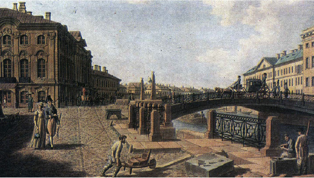 Строительство Набережной реки Мойки. Вид на Полицейский мост. Фрагмент. Бенжамин Патерсон. Раскрашенный акварелью офорт. Начало XIX века.