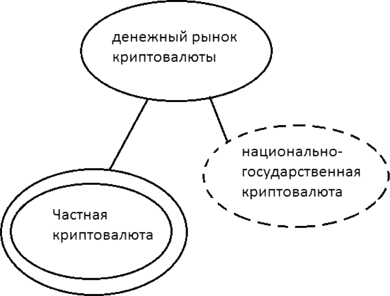 Вторая схема – это сегменты денежного рынка криптовалюты. Особенность его в том, что появляются два вида валюты – частная и государственная, причем первая возникает раньше второй. Это осложняет процесс появления государственных криптовалют и их взаимодействия с частными валютам. Некоторые эксперты отмечают, что функционирование криптовалюты может нанести вред государственным финансам, ограничить их функции, в частности: из-за ослабление контроля за денежно-кредитной сферой, из-за появление новых методов ухода от налогов.